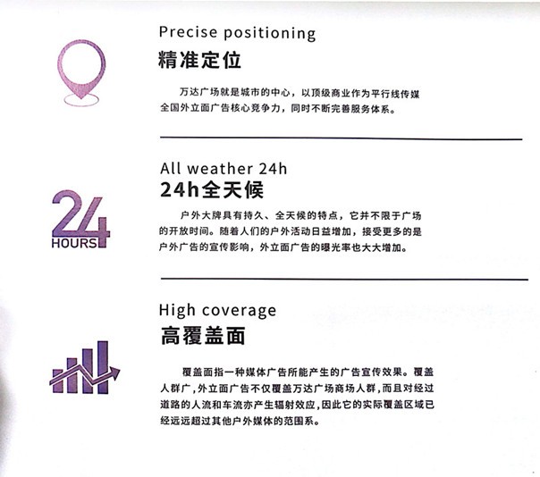 萬達廣場主要分布在中產階級崛起、消費發展富裕的經濟發達地區省會及重點城市,覆蓋一線特別是二三線城市中高消費人群。其中戶外大牌覆蓋近300家萬達廣場。