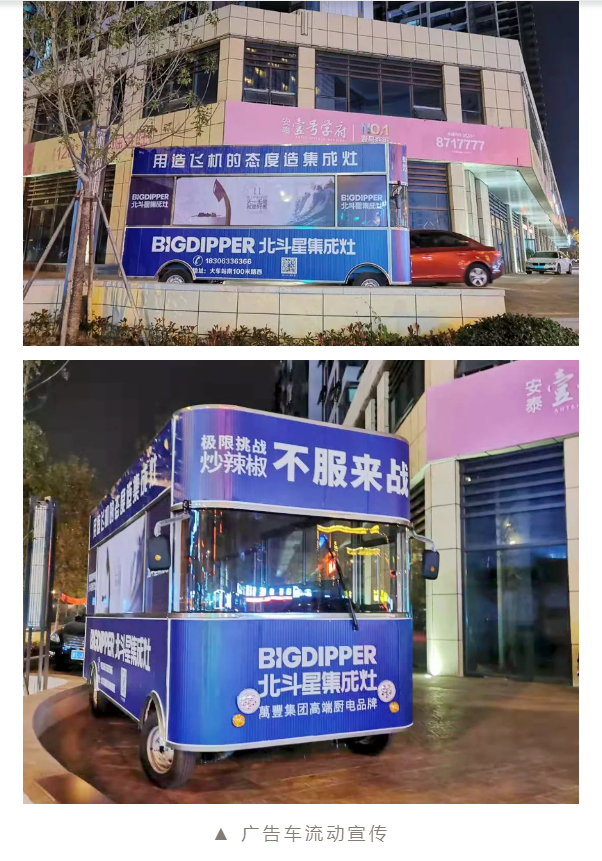 其天藍色的主視覺給人科技聯想之感,融合了極具特色的萬豐旗下鉆石飛機以及北斗星精工產品等元素,牢牢抓住消費者視覺感官,成為了這個城市一道靚麗的移動風景線。“以造飛機的態度造集成灶”的精工理念在目標消費者心中反復刷屏直至留下深刻印象。