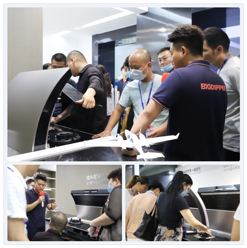 展廳現場,工作人員為大家展示了北斗星家族產品標志性的創新特性——“天一無縫,就是好擦”的一體式無縫臺面,擦洗無死角,就是好清理!更有“爆炒辣椒無嗆味”,讓在場的所有人士為之贊嘆不已,北斗星集成灶吸煙功能真棒!