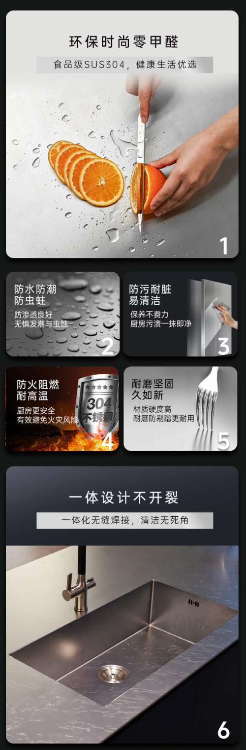 甄選304食品級不銹鋼作為產(chǎn)品基材,不含甲醛、苯等污染源,無懼與食物直接接觸,將米其林三星廚房搬回家。