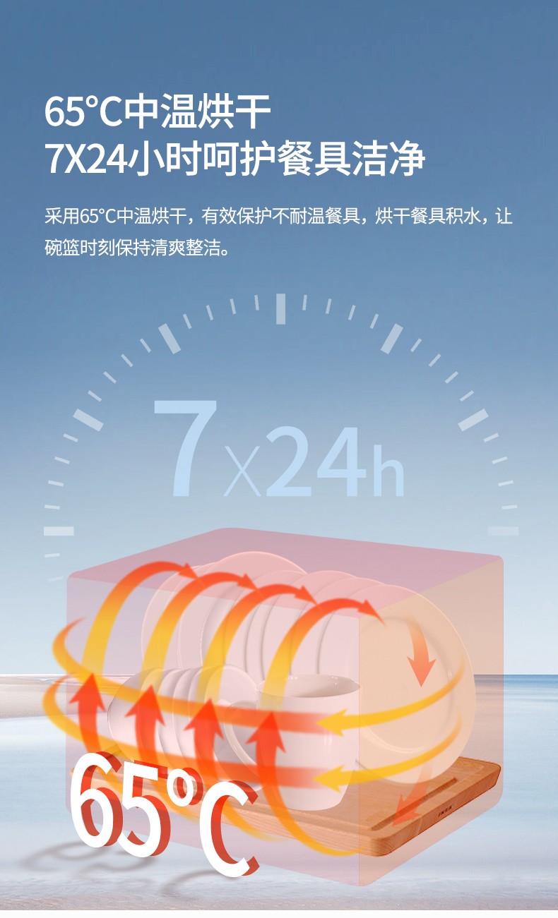 65°C中溫烘干 7×24小時呵護餐具潔凈